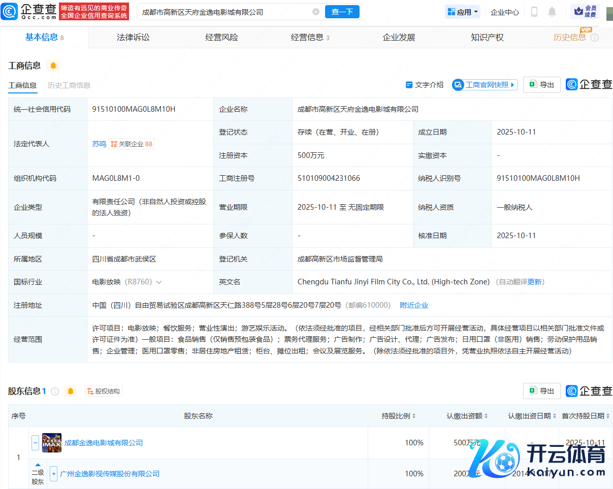 近日开yun体育网,成齐市高新区天府金逸电影城有限公司成就,法定代表东谈主为苏鸣,忖度领域包含:电影放映;餐饮奇迹;交易性上演;游艺文娱举止;票务代理奇迹;告白制作等。企查查股权穿透露出,该公司由金逸影视(002905)迤逦全资捏股。