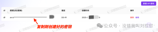 自行部署的话,亦然先新建API密钥,跟硅基流动一样: