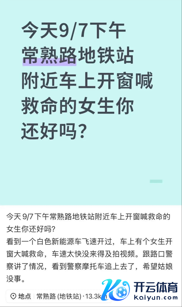 上述网友发帖称,9月7日,其在上海市常熟路地铁站隔邻,看到一辆白色新动力车赶快开过,车上有女生开窗大叫救命,“跟路口巡警讲了情况,看到巡警摩托车追上去了,但愿密斯没事。”