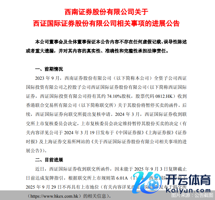 北京商报讯(记者 李海媛)9月15日,西南证券公告称,近日,西南证券全资子公司西证国外投资有限公司之控股子公司西证国外证券收到香港诱惑交游悉数限公司(以下简称“联交所”)函件,因未能于2025年9月3日复牌截止日前达成复牌诱惑,凭证联交所上市规则,西证国外证券将于2025年9月29日不再具有上市地位。