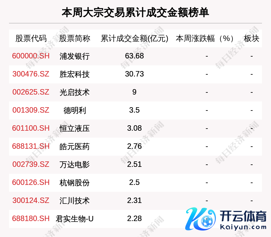 本周大量交往累计成交金额前3的公司是浦发银行、、光启时间,累计成交金额离别为63.68亿元,30.73亿元,9亿元。